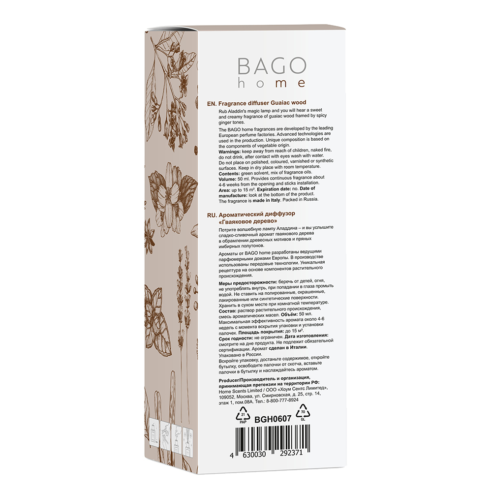 Аромадиффузор с палочками Bago home Гваяковое дерево 50 мл