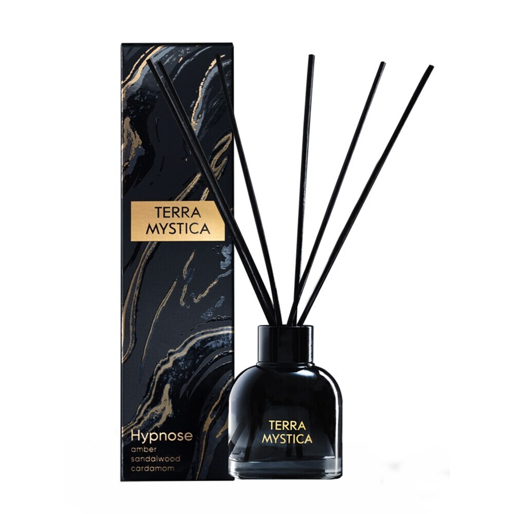 Флаконы в дымчатом градиентном прокрасе и элегантные палочки глубокого черного цвета откроют путь к эксклюзивной парфюмерной композиции Hypnose. Стильная черная упаковка с золотыми абстрактными формами выглядит роскошно и безошибочно укажет путь к мистической философии ароматов. Используя разное количество палочек можно удобно регулировать интенсивность аромата в помещении: чем больше палочек вставлено в диффузор, тем сильнее и насыщеннее распространяется аромат. Стойкость аромата до 6 недель, в зависимости от помещения и интенсивности использования.
