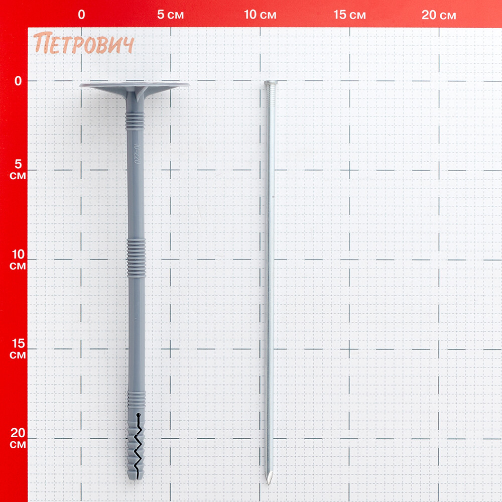 Материал дюбеля - ударопрочный полипропилен, материал гвоздя - металл (IZM). Сохраняет свои свойства при низких температурах вплоть до -30°C. Продукция прошла сертификацию и имеет Техническое свидетельство Минстроя РФ.