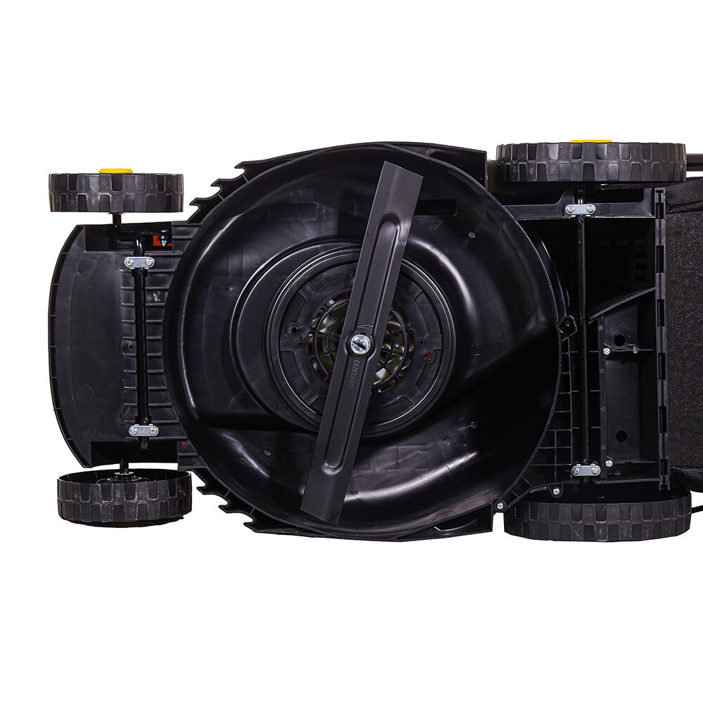 Комплектация: Газонокосилка; Ручка пуска двигателя; Рукоятка управления; Травосборник; Задняя крышка; Колёса; Инструкция; Упаковка.