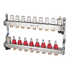 Комплектация: Коллектор 1" внутр(г) х 8 отводов 3/4" нар(ш) х 1" внутр(г) с термостатическими клапанами, коллектор 1" внутр(г) х 8 отводов 3/4" нар(ш) х 1" внутр(г) с расходомерами, воздухоотводчик – 2 шт., отсекающий клапан воздухоотводчика – 2 шт., дренажный поворотный кран – 2 шт., кронштейн для монтажа коллекторов - 2 шт.