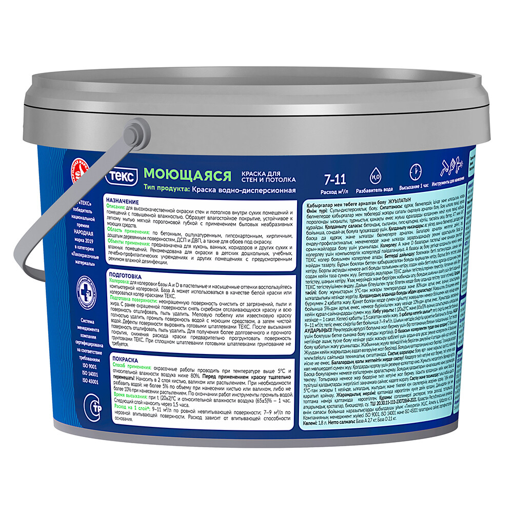 Краска моющаяся Текс Профи база А белая 1,8 л