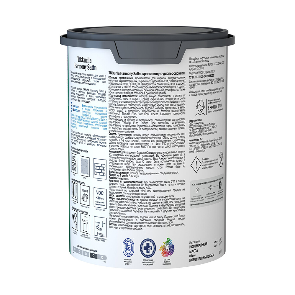 Краска моющаяся Tikkurila/Tikkivala Harmony Satin база С бесцветная 0,9 л