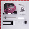Комплектация: Лобзик в сборе – 1 шт., Пилка по дереву – 1 шт., Адаптер для пылесоса – 1 шт, Пластиковая накладка на подошву - 1 шт., Накладка для защиты от сколов - 1 шт., Параллельный упор – 1 шт., Шестигранный ключ – 1 шт., Руководство по эксплуатации с гарантийным талоном, Картонная упаковка.