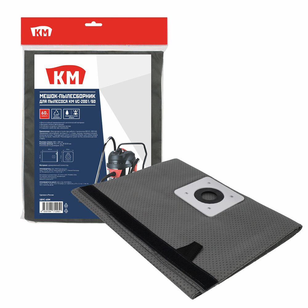 Мешок для пылесоса КМ 60 л к модели VC-2001/60 армированный полиэстер для сухой и влажной уборки (SBVC-60М)