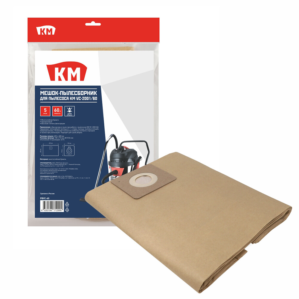 Мешок для пылесоса КМ 60 л к модели VC-2001/60 бумага для сухой уборки (5 шт.) (PBVC-60)