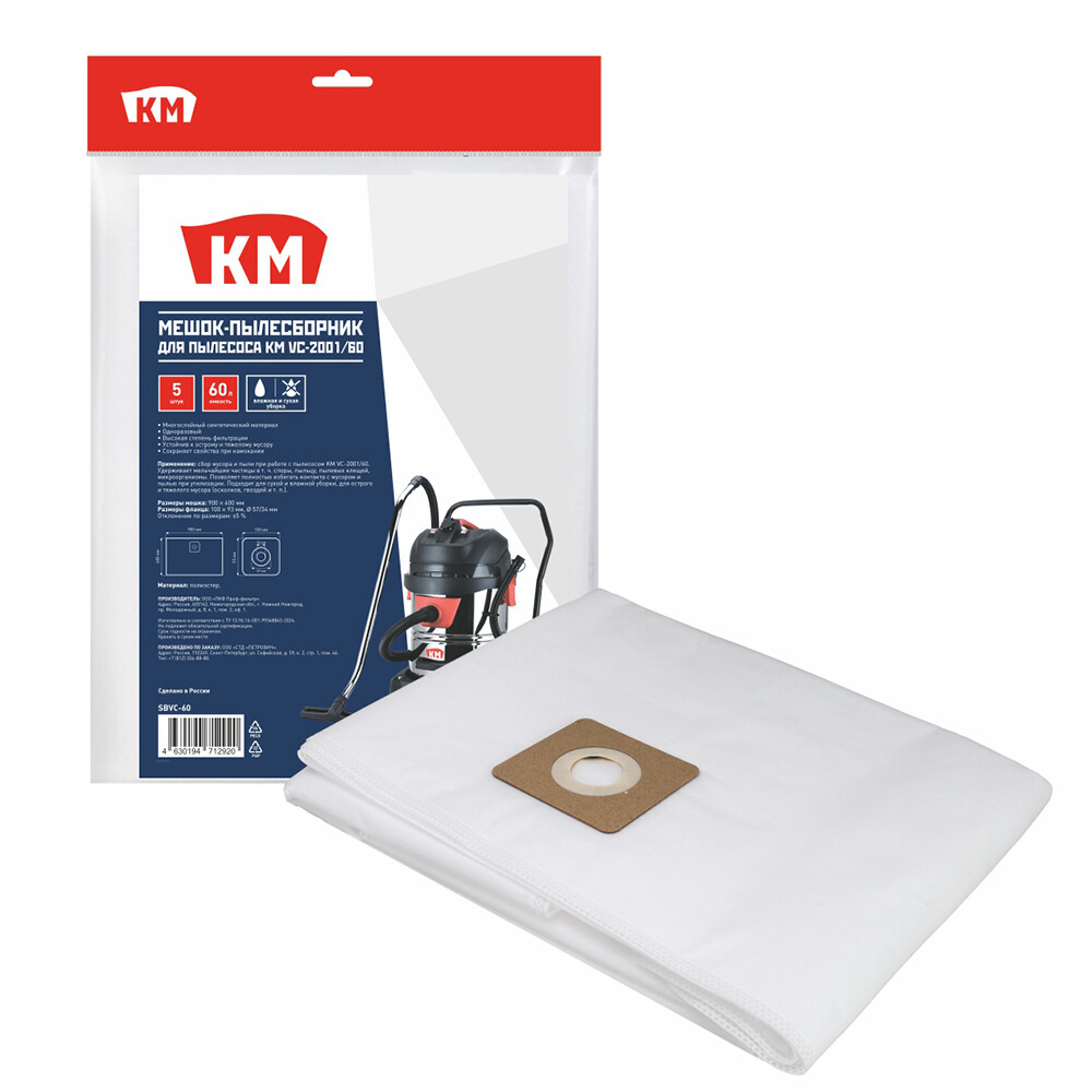 Мешок для пылесоса КМ 60 л к модели VC-2001/60 полиэстер для сухой и влажной уборки (5 шт.) (SBVC-60)