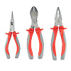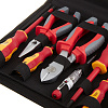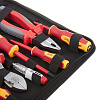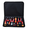 Комплектация: Диэлектрические пассатижи 180 мм, диэлектрические бокорезы усиленные 180 мм, диэлектрические длинногубцы 160 мм, диэлектрическая отвертка: шлиц 3х75, диэлектрическая отвертка: шлиц 4х100, диэлектрическая отвертка: шлиц 5.5х125, диэлектрическая отвертка: PH1x100, диэлектрическая отвертка: PH2x100, отвертка-индикатор, водозащитная сумка-кофр.