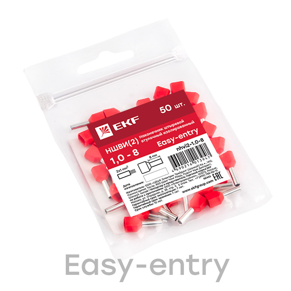 Наконечник штыревой втулочный изолированный EKF PROxima НШВИ-2 8 мм х 1 кв. мм двойной (50 шт.)