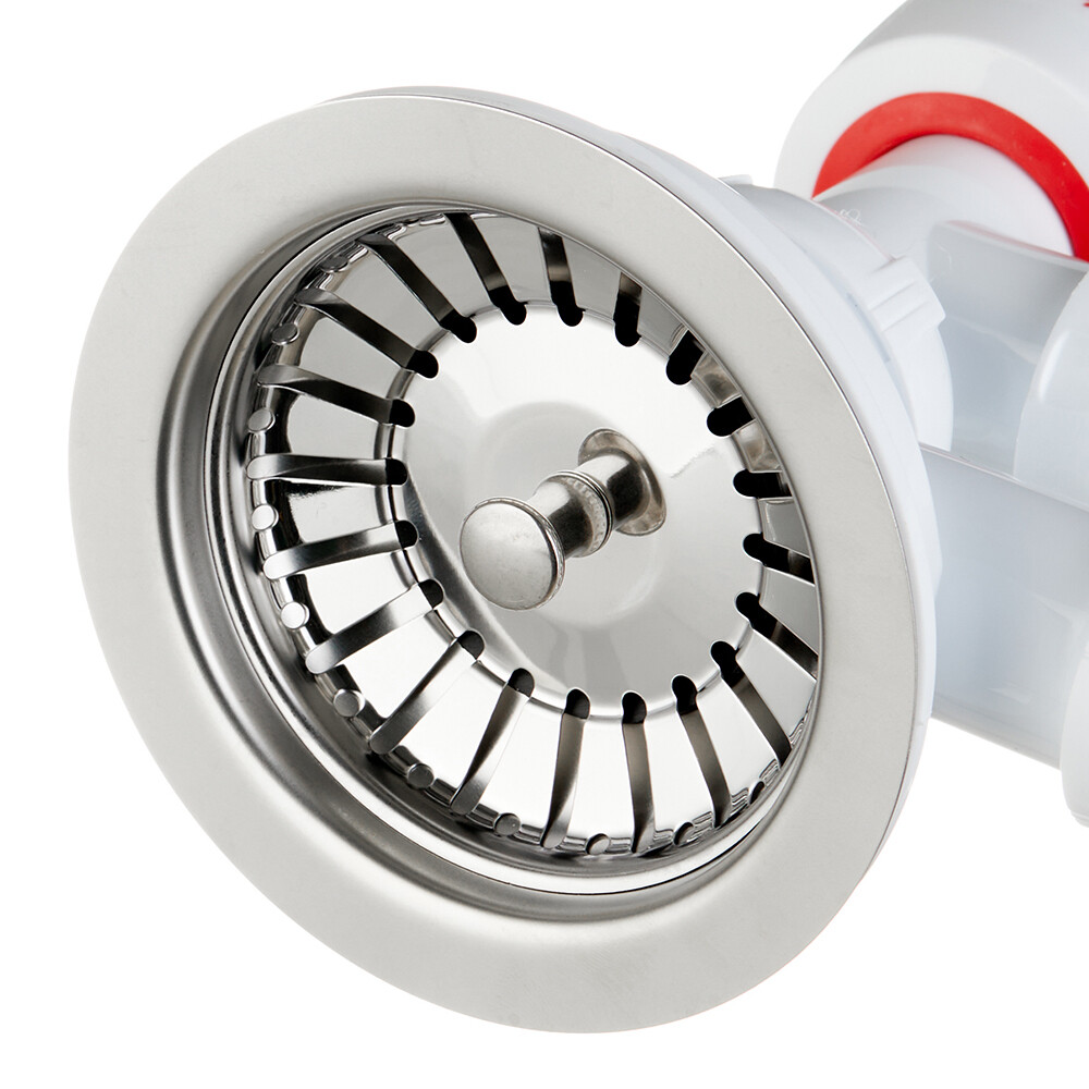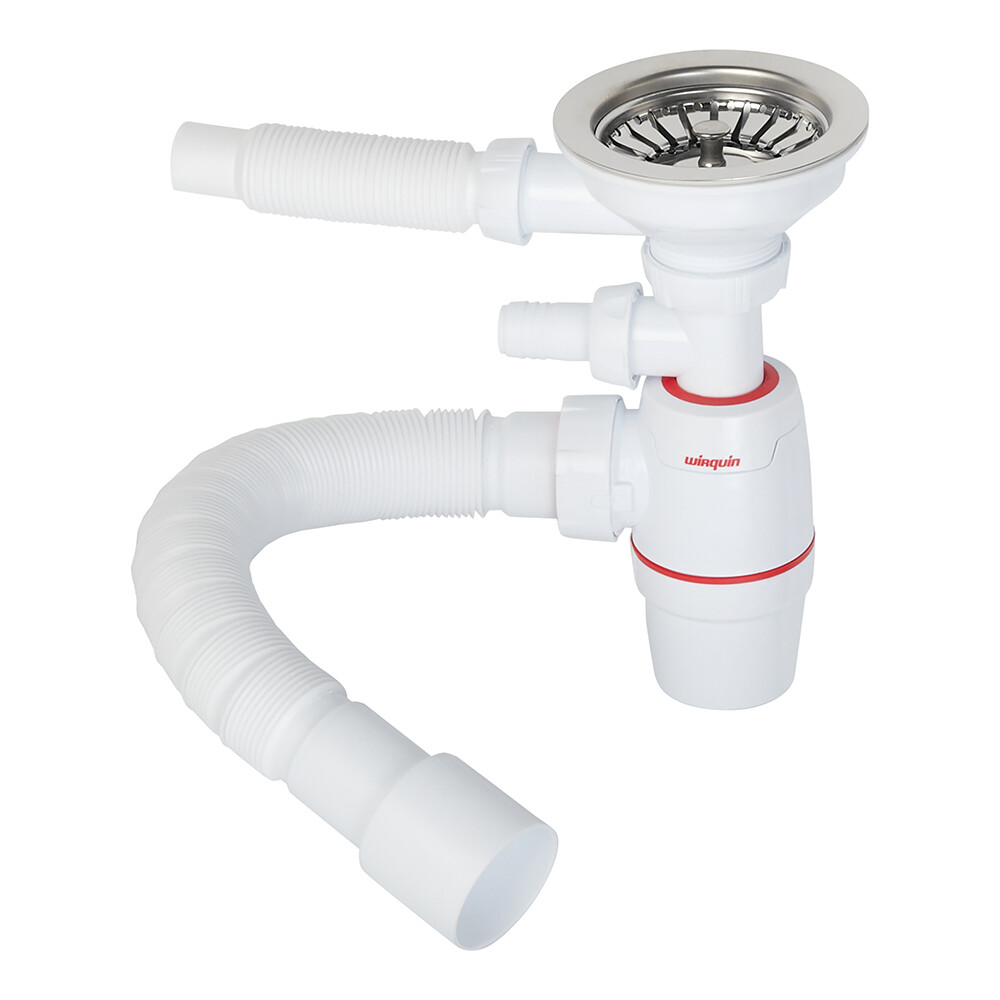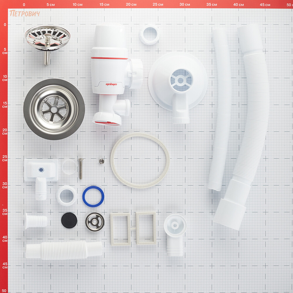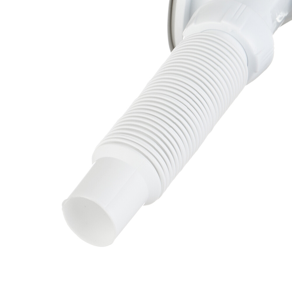 Комплектация: Сифон для мойки с отводом под стиральную машину, выпуск с нержавеющей чашкой D114 мм, перелив прямоугольный и круглый, гибкое соединение.