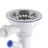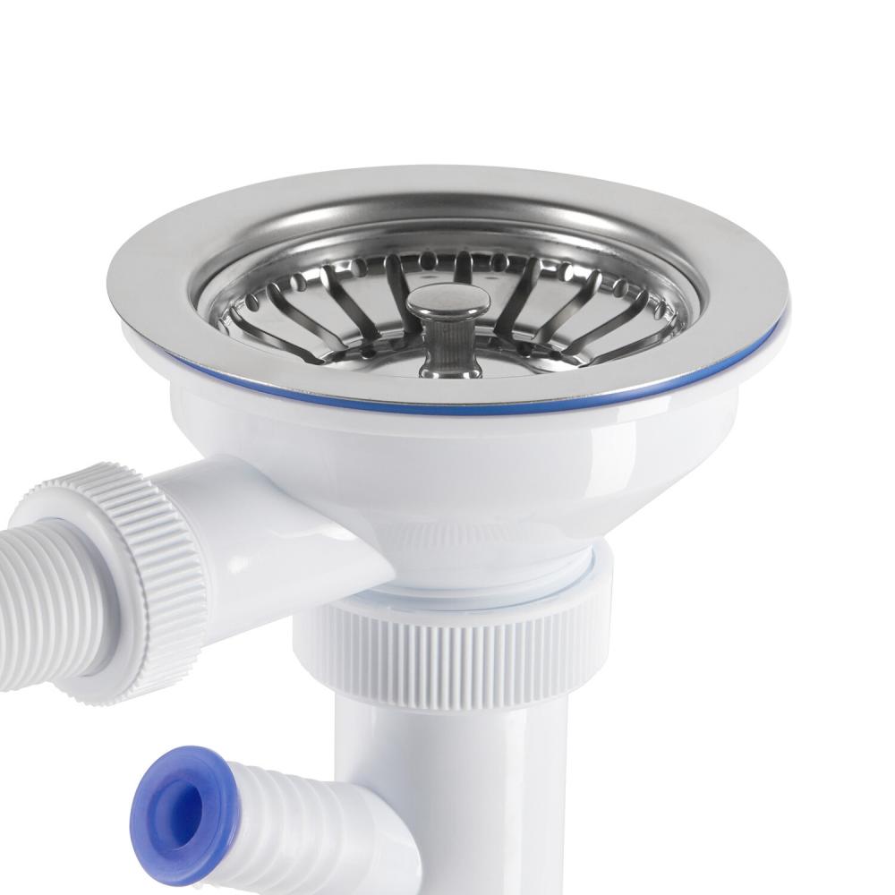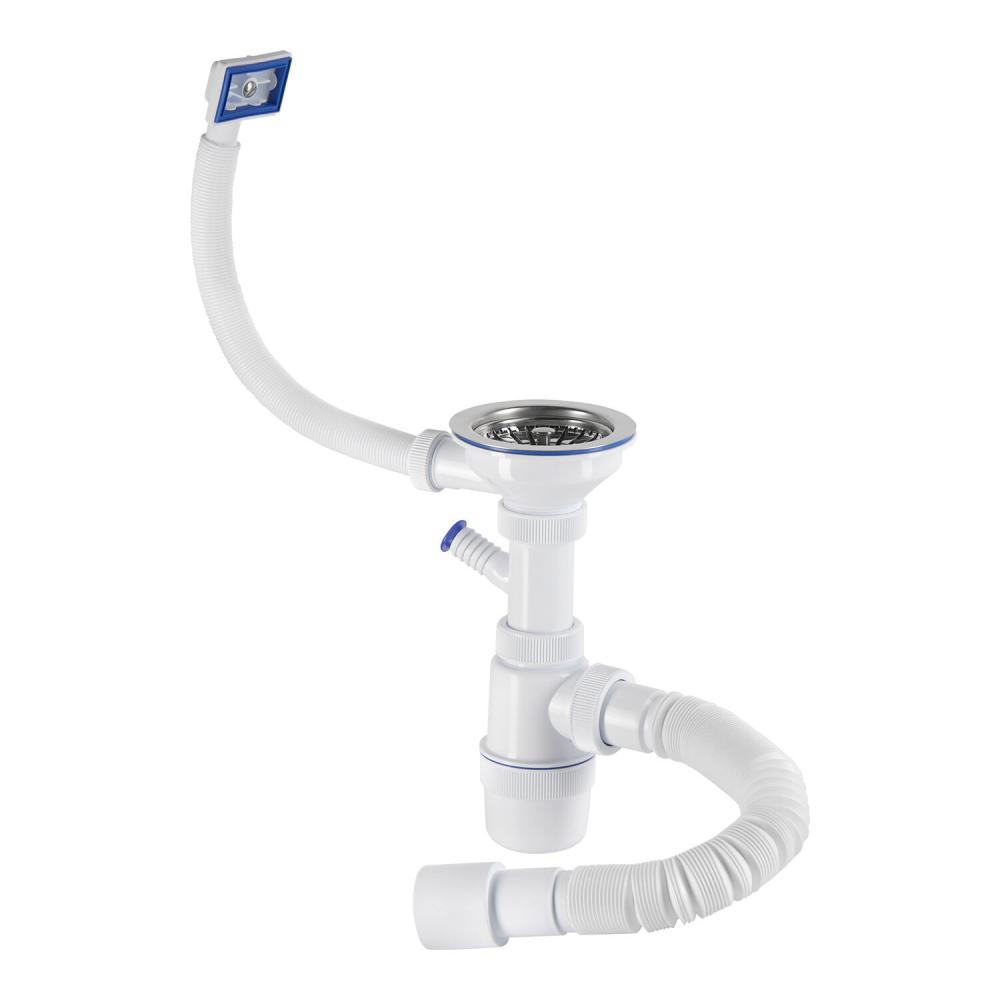 Комплектация: Сифон для мойки с отводом под стиральную машину, выпуск с нержавеющей чашкой D115 мм, перелив прямоугольный и круглый, гибкое соединение.