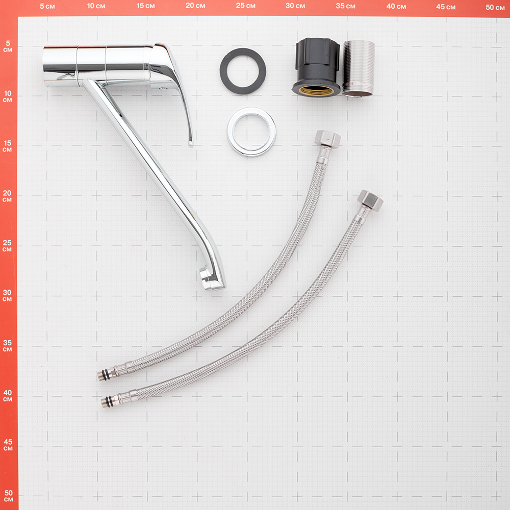 Комплектация: смеситель - 1 шт., гибкая подводка из нетоксичной EPDM резины в оплетке из нержавеющей стали, М10 - 1/2, крепление.
