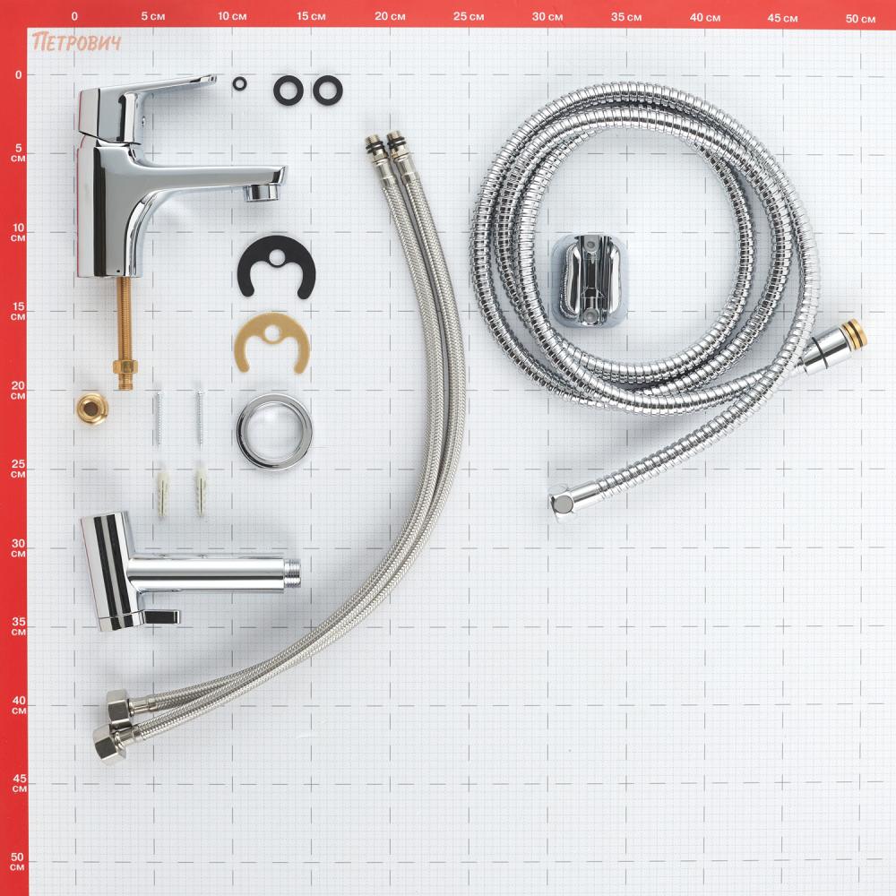 Комплектация: Смеситель - 1 шт., душевой шланг -1 шт., гигиеническая лейка - 1 шт., держатель - 1 шт., монтажный набор - 1 шт., гибкая подводка - 1 шт., инструкция по эксплуатации с гарантийным талоном - 1 шт.