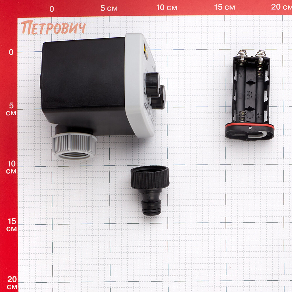 Таймер может работать как от водопровода, так и от бочки самотеком. Работает от 2 батареек типа АА (в комплект не входят).