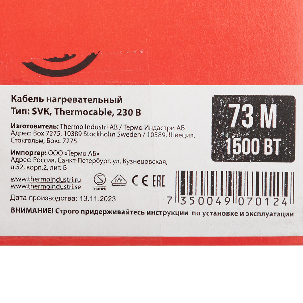 Расшифровка маркировки: 73 м - длина кабеля, 12-15 м2 - площадь укладки, 1500 Вт - общая мощность кабеля.